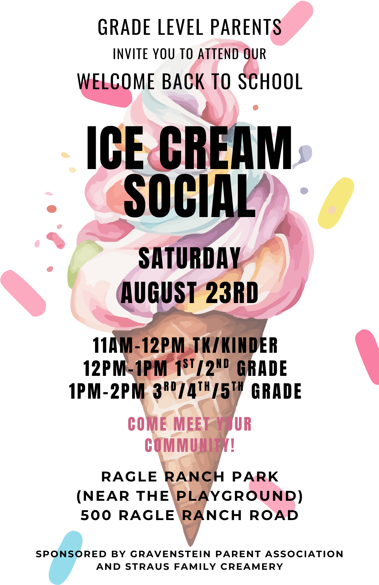 The Gravenstein Grade Level Parents invite Gravenstein Elementary Families to attend a Back to School Ice Cream Social at Ragle Ranch Park. Sponsored by Straus Creamery this event offers families an opportunity to connect with their 2025/2026 Grade Level Parents as well as other families and students in our community. Check the flyer for your grade level time slot!