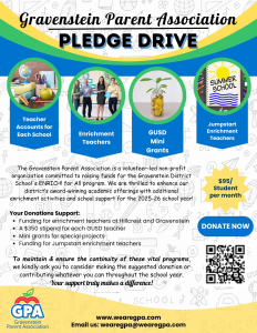 The start of a new school year means Gravenstein Parent Association has to get to work! Help us raise money to fund our wonderful Enrichment Programs by participating in our annual back to school Pledge Drive! Your donations help fund our Enrichment Programs at both Gravenstein and Hillcrest campuses as well as support our teachers through classroom funds and our mini-grant programs. Get your pledges in by 9/5 to be entered into our drawing! Thank you for your support!!! Here is our Pledge Form.