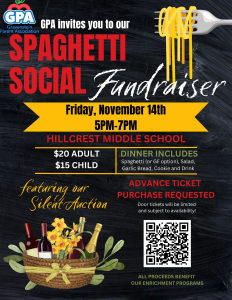 The GPA is hosting a Spaghetti Social & Silent Auciton held in Hillcrest Hall on Nov. 14th. There will be dinner provided with paid tickets and a silent auction. The silent auction is made up of baskets that were put together by our wonderful group of GLP’s (Grade Level Parents) who used parent donations. All are invited to bid on the baskets. Winners will be announced at the end of the event. Winners who are not present will be emailed/called.